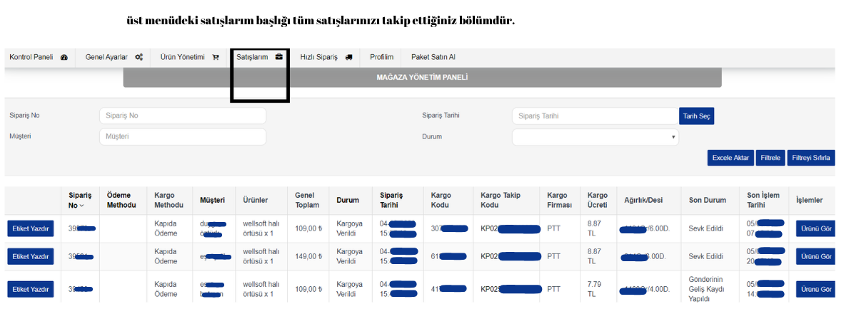 Magaza yönetim paneli " satışlarım " başlığından tüm siparişlerinizin durumunu takip edebilirsiniz.